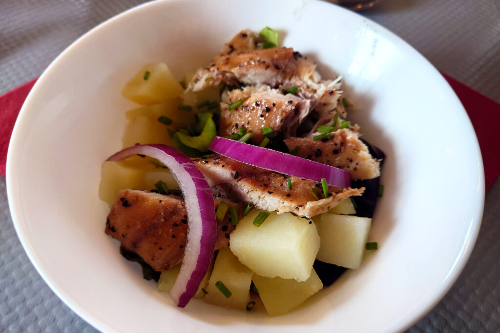 出てきたのは、この鯖とジャガイモのサラダ的な何かとショートパスタのボロネーゼに、パンナコッタ(*’▽’)